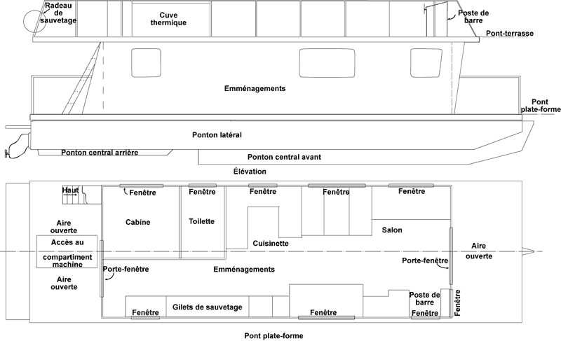 Les emménagements situés sur le pont plate-forme comprenaient un salon, une cuisinette, une toilette et une cabine. À l'avant tribord du pont plate-forme se trouvait un poste de barre comprenant la barre, les commandes moteur, un compas magnétique et une radio. À l'arrière du pont plate-forme se trouvait une petite aire ouverte ouvrant sur les emménagements avec une échelle permettant de se rendre au pont-terrasse aménagé sur le toit de l'embarcation de plaisance. Il y avait également une autre petite aire ouverte à l'avant du pont plate-forme (voir l'Annexe B).