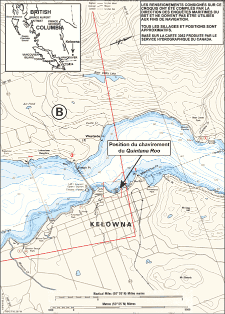 Vers 22 h 50 le 8 juin 2005, par beau temps, l'embarcation de plaisance louée Quintana Roo appareille du quai public à Kelowna (Colombie-Britannique) avec 61 personnes à son bord, dont 55 sur le pont-terrasse aménagé sur le toit de l'embarcation de plaisance et 6 dans les emménagements. Quelques minutes après avoir quitté son poste d'amarrage, l'embarcation s'incline sur bâbord et chavire rapidement. De nombreuses personnes sautent de l'embarcation ou tombent à l'eau; certaines d'entre elles ainsi que des passants portent secours aux personnes coincées dans l'embarcation. Bilan, quelques personnes subissent des blessures légères et une personne succombe à ses blessures à l'hôpital.