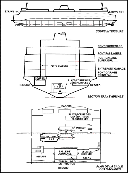 Le Queen of Oak Bay est un navire amphidrome doté d'une timonerie, d'un propulseur à hélice à pas variable et d'un gouvernail à chaque extrémité du navire. La salle des machines est située au milieu du navire. Les deux extrémités du navire sont presque identiques; elles sont numérotées respectivement no 1 et no 2. C'est ce qui détermine les côtés bâbord et tribord du navire et la numérotation des moteurs dans la salle des machines. (Voir Figure 1.)
