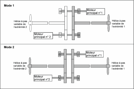 De multiples combinaisons de moteurs, d'embrayeurs et d'hélices sont également possibles et peuvent être commandées depuis le poste de commande de la salle de commande des machines, et un ou l'autre des moteurs peut entraîner une ou l'autre hélice.