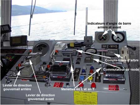 Les deux leviers de direction sont utilisés durant les manoeuvres d'accostage lorsqu'il faut un surcroît de manoeuvrabilité. Le capitaine utilise alors à la fois les deux leviers de commande de propulsion et les deux leviers de direction.
