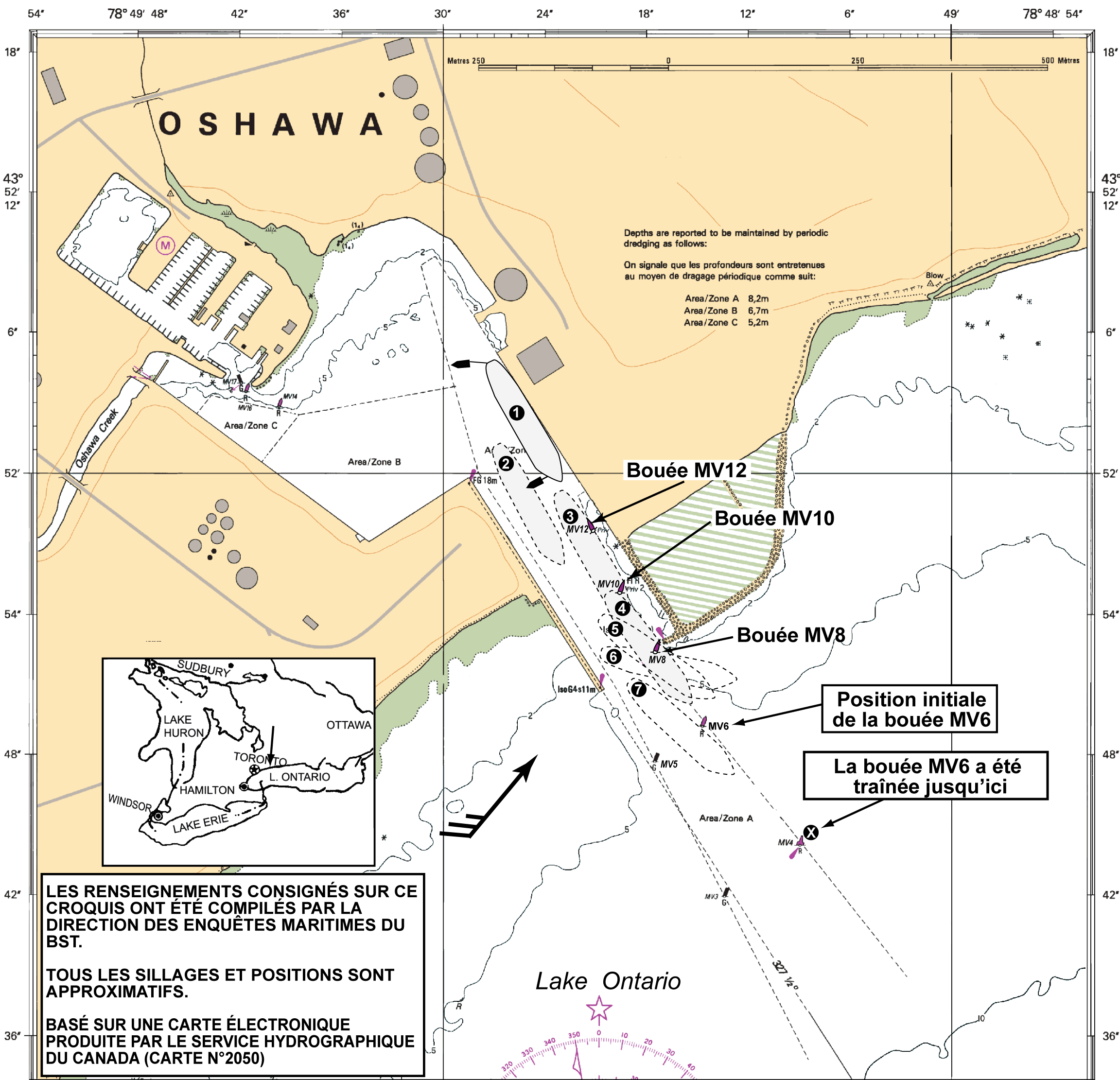 En progressant dans le chenal, les navires traînent la bouée MV6 sur quelque 195 m. Elle finit par s'immobiliser à proximité de la bouée MV4, située à l'extérieur du port (voir Photo 5). La bouée MV6 est lourdement endommagée.