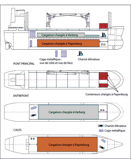 Dans le cas présent, les trois conteneurs en pontée arrimés sur la partie avant des panneaux de cale ainsi que la cargaison dans la cale inférieure avaient été chargés en Allemagne. La cargaison arrimée sur l'entrepont avait été chargée en Suède. Sur les deux ponts, un dégagement de 6 m avait été prévu à chaque extrémité de la cale, entre la cargaison et les cloisons, pour que les chariots élévateurs puissent se déplacer.
