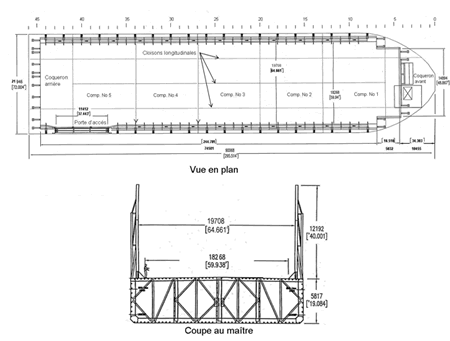 Le chaland OTM 3072 est fait d'acier. La coque est divisée en 26 compartiments étanchesNote de bas de page 3 par trois cloisons longitudinales et six cloisons transversales (voir Annexe A). Des montants et un treillis métalliques d'une hauteur de 12,19 m forment une enceinte sur le pourtour du pont pour contenir une cargaison solide en vrac.