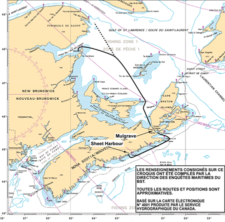 Le 26 octobre à 2 h 40Note de bas de page 4, le remorqueur avec le chaland en remorque appareille de Sheet Harbour pour se rendre à Cap-de-la-Madeleine (Québec). En raison de la période de l'année et afin d'éviter les grosses vagues et les forts vents annoncés dans les prévisions météo pour le détroit de Cabot et le détroit de Northumberland, le capitaine décide d'emprunter une route qui traverse le détroit de Canso (voir Annexe B). Le remorqueur et le chaland arrivent sans encombre à Mulgrave (Nouvelle-Écosse) où ils s'abritent pour la nuit.