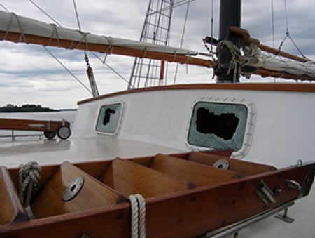 Plusieurs fenêtres du rouf ont été cassées pour faciliter la ventilation. Les emménagements ont subi de lourdes avaries causées par l'eau et la fumée.