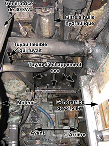 Le filtre à huile présentait une fuite mais cela n'a probablement pas été un facteur causal, car le débit de la fuite a été mesuré lors des essais effectués après l'événement et il était trop faible pour avoir provoqué les dommages importants observés et la propagation de l'incendie. Par conséquent, c'est la défaillance du tuyau flexible d'huile de la boîte de vitesses qui, en faisant pulvériser l'huile sur la partie chaude du tuyau d'échappement du moteur, est probablement à l'origine de l'incendie. Cette défaillance est due à une petite fente qui s'est développée dans la paroi externe du tuyau flexible, fort probablement en raison de l'âge avancé du tuyau. L'absence d'écran de protection a alors permis la propagation de l'incendie dans toute la partie arrière de la salle des machines où l'incendie a été alimenté par les produits inflammables entreposés directement sur l'étagère.