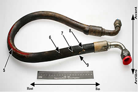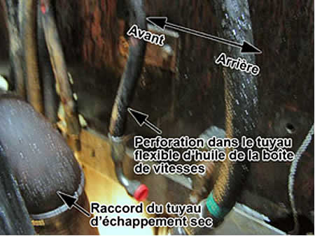 Des essais effectués après l'événement ont révélé que lorsque le moteur était en marche, l'huile de la boîte de vitesses était pulvérisée sur la partie chaude du tuyau d'échappement sec à partir d'une perforation dans le tuyau flexible. Un examen plus poussé a également révélé la présence d'une petite fente, probablement antérieure à l'incendie. En plus, lorsque le moteur a été coupé, on a vérifié le niveau d'huile dans la boîte de vitesses, et le carter était presque vide.