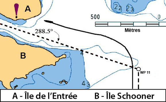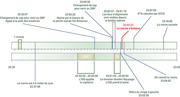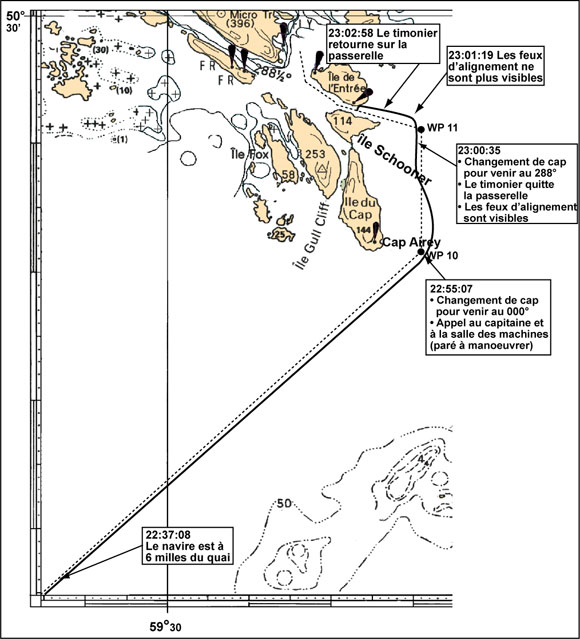 Après avoir heurté l'île de l'Entrée, le navire traverse l'étroit passage et vient proche de s'échouer sur l'île Schooner. Le timonier voit alors les feux d'alignement sur l'avant et amène le navire vers le milieu de la voie navigable (voir la Figure 2).