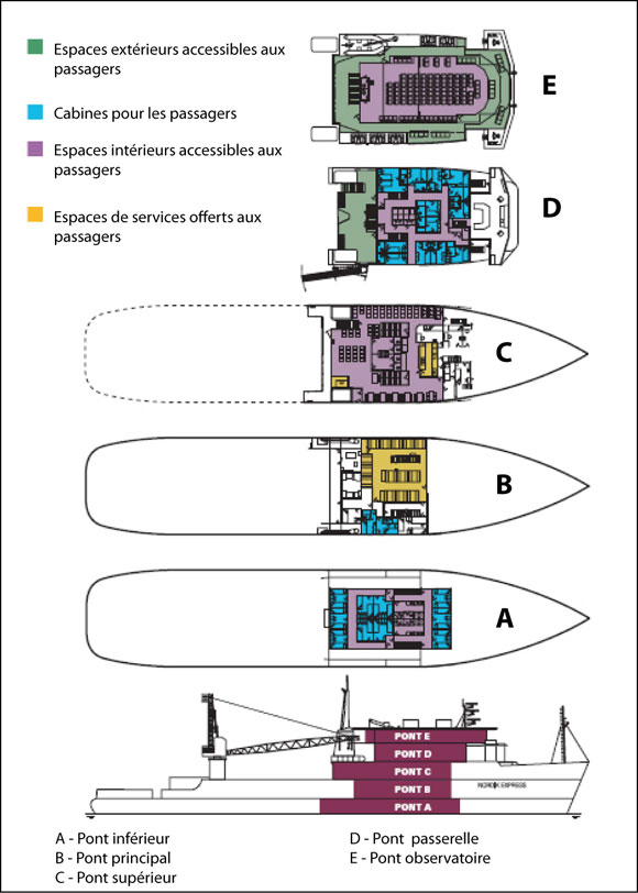 Le Nordik Express est immatriculé comme navire à passagers. Il peut transporter 268 passagers et compte 72 couchettes. Il transporte également des marchandises diverses et il a une capacité de transport de conteneurs de 60 EVPNote de bas de page 3. Il a été construit en 1974 comme navire ravitailleur. Après avoir été acquis par un nouveau propriétaire, le navire a fait l'objet d'une refonte en 1987 pour servir au transport de passagers et de marchandises diverses conteneurisées le long de la Basse-Côte-Nord du golfe du Saint-Laurent. En 2001, le navire a subi d'autres modifications qui lui ont donné sa configuration actuelle (voir la Photo 1 et l'Annexe A).