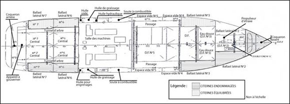 Le navire a subi des avaries importantes sur son côté tribord, près de l'étrave, sur la hanche et à l'hélice. Le coqueron avant, le ballast no 1C, et les ballasts tribord nos 2, 3, 6 et 7 ont été percés et ont pris l'eau (voir l'Annexe F), causant l'envahissement des ballasts bâbord nos 3, 6 et 7, étant donné que les ballasts bâbord et tribord sont reliés par des tuyaux d'équilibrage.