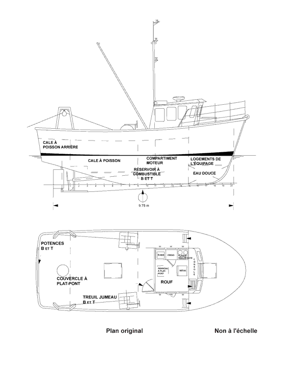 Le bateau avait subi plusieurs modifications; certaines visaient à satisfaire aux restrictions sur la longueur imposées par le ministère des Pêches et des Océans (MPO) tandis que d'autres avaient pour but de permettre différents types de pêche. Par exemple, les changements suivants (l'ajout d'un deuxième enrouleur de chalut au-dessus de l'enrouleur d'origine, l'enlèvement d'une longueur de 0,76 m de la partie avant du bateau et l'ajout d'une rallonge de 0,61 m à l'arrière du bateau) ont eu pour effet de modifier l'aire de flottaison et le déplacement du bateau. Conjugués au stockage des prises dans des caisses sur le pont plutôt que dans les cales, ces changementsNote de bas de page 19 ont probablement provoqué une élévation du centre de gravité.