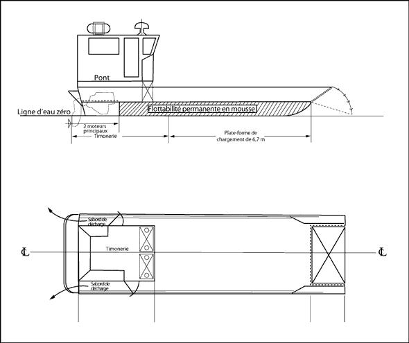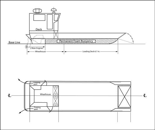 Le navire est équipé d'une coque en caisson munie de coffres en mousse polyuréthane recouverts de fibre de verre à haute résistance lui assurant une flottabilité positive. Le navire n'a pas de bouchains (voir Annexe B - Plan d'ensemble du navire).