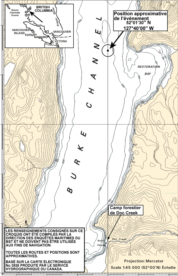 À 18 h 30Note de bas de page 3 le 29 octobre 2008, le Jumbo B rentre au camp forestier de Doc Creek après s'être rendu à un site situé sur l'île King (C.-B). Il transporte environ 1250 kg de cônesNote de bas de page 4 chargés en pontée dans l'axe longitudinal du navire.