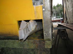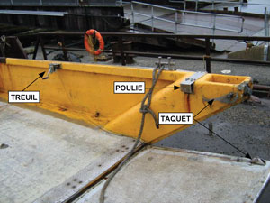 Dans le présent événement, le système de treuillage et ses composants avaient été modifiés seulement un an auparavant, pourtant la poulie bâbord était déjà corrodée au point de ne plus tourner librement. Le câble était également corrodé à son point de passage dans la poulie. Des sections du joint de caoutchouc servant à assurer l'étanchéité entre la porte rampe et la péniche étaient manquantes et les trous dans le gousset du taquet étaient ovalisés, indiquant que le taquet avait été soumis à des contraintes excessives.
