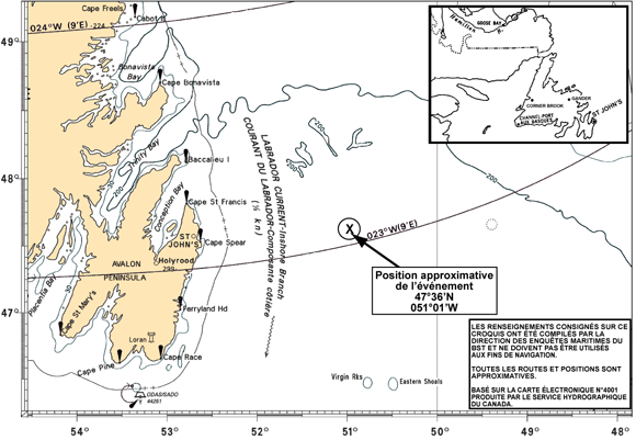 Le soir du 7 septembre 2009, le Sea Gypsy Enterprises appareille de Port de Grave (Terre-Neuve-et-Labrador) avec un équipage de cinq personnes pour aller pêcher la crevette. Le matin du 9 septembre, le bateau arrive sur les lieux de pêche et commence à pêcher. Dans l'après-midi du 11 septembre, la cale à poisson est remplie d'environ 29 200 kg de crevette (dans des sacs) et de 4000 kg de glace. Environ 450 kg de crevette sont stockés sur le pont et 560 kg sont stockés sur le pont supérieur à l'arrière de la timonerie. Le voyage de retour se déroule sans incident jusqu'aux environs de 11 h 9Note de bas de page 6 le 12 septembre. Puis, au cours des 15 minutes suivantes, la vitesse du bateau chute de 6,2 à 4,0 nœuds. Le capitaine en est informé. À ce moment, le bateau embarque de l'eau par-dessus les pavois.