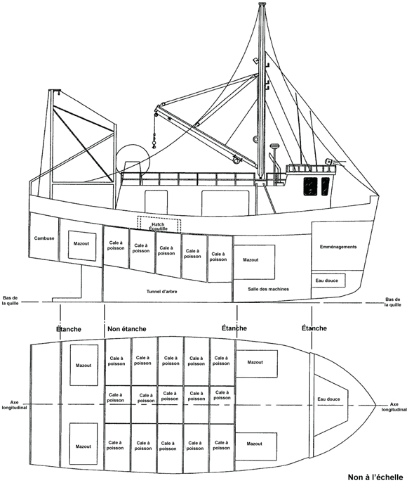 Le Sea Gypsy Enterprises était un petit bateau de pêche ponté, de type Cape Island, à coque moulée en polyester renforcé de fibre de verre. La timonerie et les emménagements étaient situées à l'avant et la salle des machines était située sous la timonerie. La coque était divisée par quatre cloisons transversales et abritait (à partir de l'avant) les emménagements, la salle des machines, une cale à poisson, le compartiment de l'appareil à gouverner et la cambuse (voir l'Annexe B). Seule la cloison entre la cale à poisson et le compartiment de l'appareil à gouverner n'était pas étanche.Note de bas de page 2