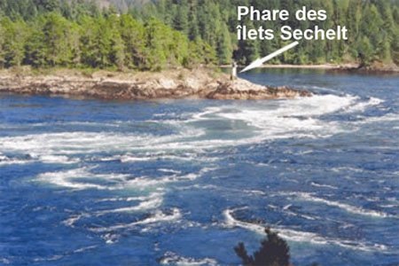 Les rapides Sechelt, appelés rapides Skookumchuck par les gens de l'endroit, sont situés à l'entrée du passage SecheltNote de bas de page 9. Les rapides ont environ 1000 m de longueur sur 500 m de largeur. Les courants de marée dans les rapides peuvent atteindre 16 nœuds durant les grandes marées.