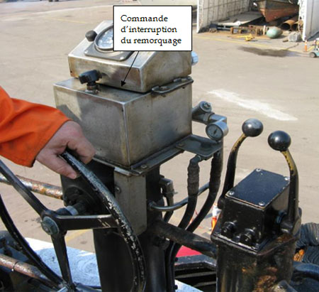 Dans le cas qui nous occupe, la commande d'interruption du remorquage avait été vérifiée avant le départ et elle était facilement accessible à tous les postes de gouverne ainsi qu'au treuil de remorquage.