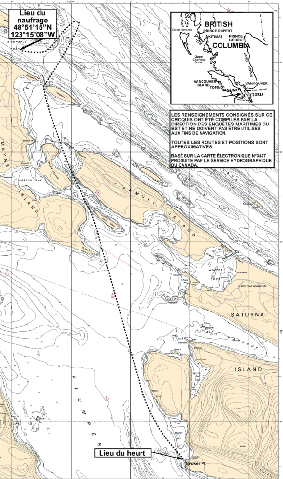 À 9 h 10Note de bas de page 4 le 23 juillet 2009, l'Explorathor appareille de Steveston (Colombie-Britannique) avec à son bord 32 passagers et 2 membres d'équipage, pour effectuer une excursion d'observation des baleines aux îles GulfNote de bas de page 5 (Colombie-Britannique). L'effectif du navire comprend le capitaine et un membre d'équipage qui exerce également les fonctions de naturaliste et de guide touristique. À 12 h 5, le navire entreprend son voyage de retour vers Steveston en passant par le passage Plumper puis le détroit de Géorgie (Colombie-Britannique). À une vitesse d'environ 28 nœuds, avec l'équipement de navigation en fonction, le capitaine utilise principalement les repères visuels pour naviguer dans le passage. Vers 12 h 52, alors que l'Explorathor passe à proximité immédiate de Croker Point, sur l'île SaturnaNote de bas de page 6 (Colombie-Britannique), le navire heurte un objet, et l'on entend un bruit de raclage. Quelques personnes à bord se cognent les genoux contre le siège devant elles ou viennent près de tomber. L'équipage rassure alors les passagers.