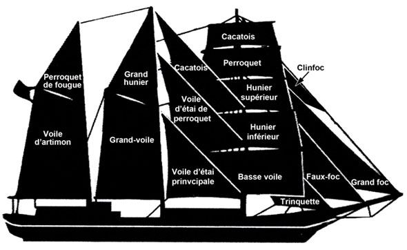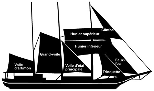Le matin du 17 février 2010, en prévision des conditions météorologiques prévues, le capitaine a réduit la voilure, ce qui a fini par donner à la fin de son quart (12 h) le plan suivant : faux-foc, trinquette, huniers supérieur et inférieur, voile d'étai principale, grand-voile et voile d'artimon roulée (voir la Figure 1) Note de bas de page 12. Le deuxième officier, qui avait le quart de 12 h à 4 h, est arrivé à son poste à 11 h 50.. Au cours du changement de quart, le capitaine et le deuxième officier ont discuté du plan de voilure et le deuxième officier a été informé que le plan établi convenait à des vents pouvant atteindre 40 nœuds. Le capitaine a demandé au deuxième officier de conserver, si possible, le vent sur l'arrière du travers et de maintenir un angle d'inclinaison confortable pour les personnes en classe. Il a aussi demandé au deuxième officier de brasser les vergues, de régler les voiles selon la direction du vent et de déborder vers bâbord, et de quitter avant tout grain de pluie. Le deuxième officier et le capitaine ont ensuite parlé des mesures à prendre s'il devenait nécessaire de réduire la toile. Le navire était en grand largueNote de bas de page 13, tribord amures, avec un cap compris entre 200° et 220° (G). Le vent apparent était de 15 à 18 nœuds, avec des vagues de 1,5 à 2 mètres en provenance du nord et une longue et faible houle en direction du sud. La température de l'air était comprise entre 29 °C et 31 °C .