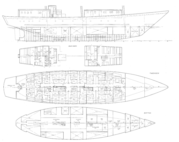 Le navire comptait 3 pontsNote de bas de page 2. Sur le pont le plus bas se trouvaient la salle des machines, les réservoirs de carburant, la citerne à eau douce, la citerne de ballast, la buanderie et des magasins. Le pont d'habitation abritait les cabines des membres d'équipage, des professeurs et des étudiantsNote de bas de page 3, 1 salon du capitaine à l'arrière et 1 salle de travail à l'avant, à bâbord. Une fois fermées, 2 portes étanches divisaient le pont d'habitation en 3 espaces distincts. Un escalier permettait l'accès aux 2 espaces avant et 1 sas de plafond à l'espace arrière.