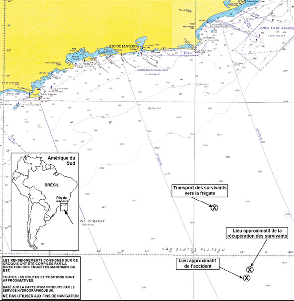 La Marine brésilienne était responsable des opérations de recherche et de sauvetage dans la région où le navire s'est renversé. Le Geostationary Operational Environmental Satellite (GOES)-12 a été le premier à détecter le signal de la RLS, le 17 février à 15 h 5 min 6 sNote de bas de page 33. La position exacte a été établie à 15 h 25 min 54 s aux coordonnées 27° 28′ S, 040° 53′ O.