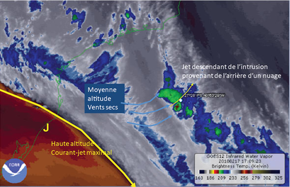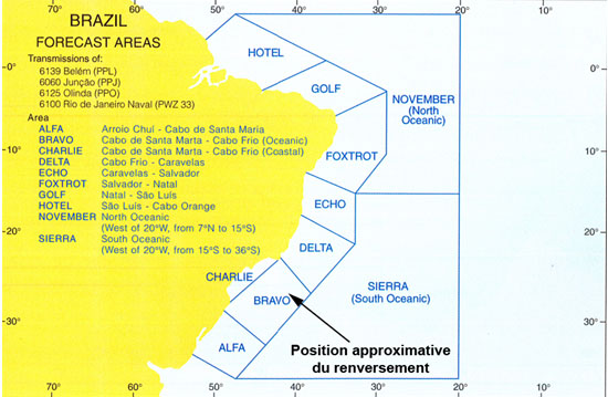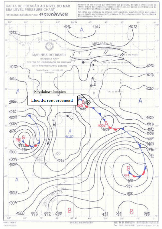 Après avoir quitté Recife, le navire avait fait face à de petits grains de pluie. Au 16 février 2010, il avait reçu de nombreuses prévisions de conditions météorologiques par le système Inmarsat-C. Ces prévisions étaient émises par le Service météorologique maritime de la Marine brésilienne responsable de la régionNote de bas de page 9. Elles indiquaient que le vent tourneraitNote de bas de page 10 au est-sud-est et augmenterait à une force Beaufort 7 ou 8Note de bas de page 11 avec des rafales. Le capitaine a informé son équipage de la venue de conditions météorologiques défavorables.