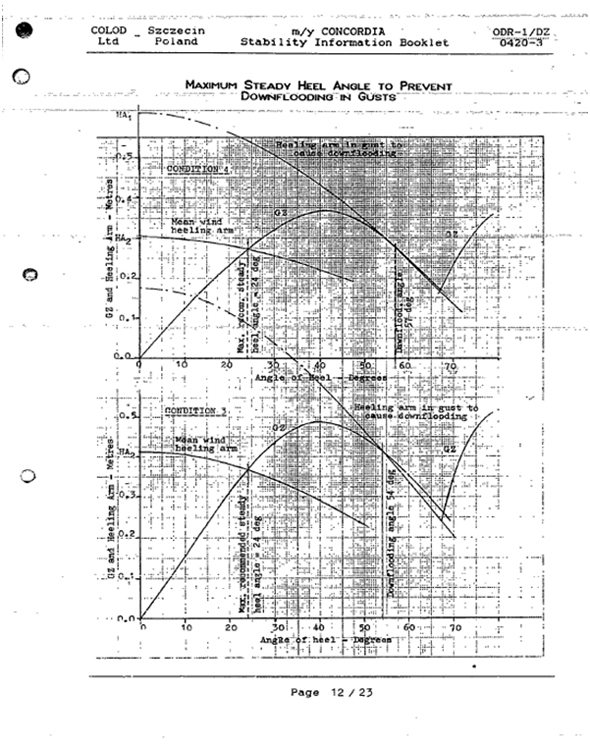 | Navire sur les extrémités du barrot | Approximation : 0 nœud à 210° * Voir les notes | Approximation : 28 nœuds à 310° | Renseignement de l'enquête : 30 nœuds à 120° à 150° Obtenu au moyen des approximations de la vitesse du navire et de la vitesse du vent réel : 28 nœuds à 100° * Voir les notes | Résultat du calcul : >88° Fondé sur le fait que la porte du pont bâbord se trouvait sous l'eau et que le radar bâbord était sur le point d'être immergé. |