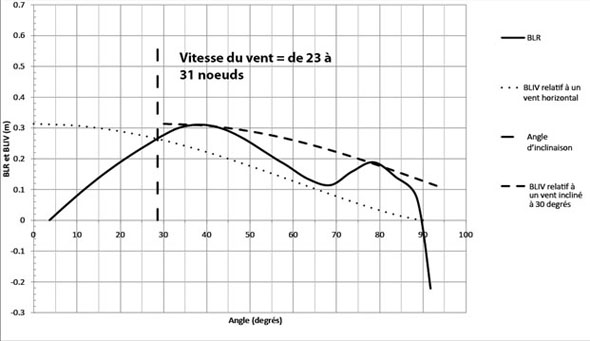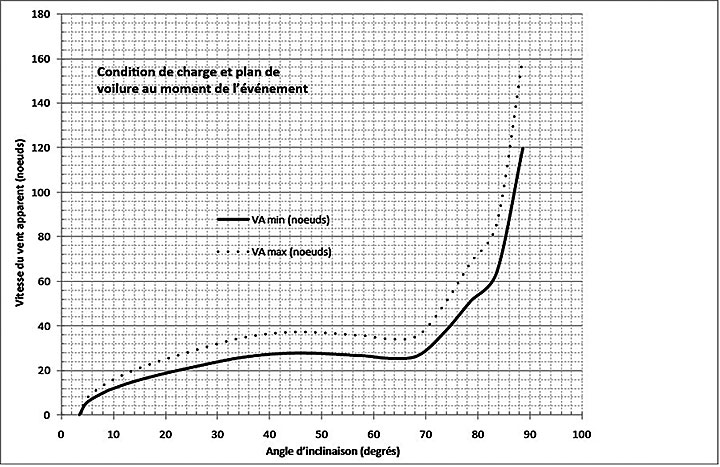 | 1423 Début du chavirement | Approximation : 9 nœuds à 210° | Approximation : 28 nœuds à 310° | Renseignement d'enquête : la vitesse du vent commence à augmenter (elle grimpe jusqu'à 27 nœuds) et l'angle apparent diminue Obtenu au moyen des approximations de la vitesse du navire et de la vitesse du vent réel : 27,9 nœuds à 81,5° * Voir les notes. | Renseignement d'enquête : Le navire commence à s'incliner; le mouvement est essentiellement continu. La plage calculée des vitesses du vent apparent pour l'inclinaison de 38° à 68° va de 27 à 37 nœuds |