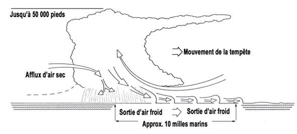 Vers 14 h 10, le grain de pluie se trouvant entre 1,5 et 2 milles nautiques du navire, les vigies sont descendues pour aller chercher leur ciré alors que d'autres ramassaient des vêtements qui séchaient sur le pont avant la venue de la pluie. Les fenêtres et les portes face au vent des 2 roufs ont été fermées, ainsi que les sas menant au magasin du maître d'équipage et au magasin à peinture. Les portes de la cuisine, de la timonerie et du poste d'équipage sous le vent à bâbord sont demeurées ouvertes.