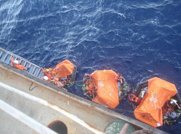 Comme les 2 radeaux pour 20 personnes que le capitaine avait libérés dans l'embelle du navire étaient trop lourds pour être déplacés, le capitaine a décidé de gonfler l'un d'entre eux sur place; mais il s'est coincé sous la passerelle. Le capitaine et le maître d'équipage ont alors tenté, sans succès, de dégager la passerelle. Le capitaine a gonflé le second radeau pour 20 personnes, qui est lui aussi resté coincé. Le capitaine et le maître d'équipage se sont alors rendus sur le pont du poste d'équipage et ont coupé les courroies de retenue du radeau de sauvetage, qui s'est retrouvé à l'envers et qu'on ne pouvait remettre en bonne position. Le maître d'équipage a ensuite coupé la courroie du compartiment de rangement des gilets de sauvetage sur le pont du poste d'équipage et le maître d'équipage et le capitaine ont remis les gilets de sauvetage aux membres de l'équipage et aux étudiants qui se trouvaient à tribord, sur la coque.