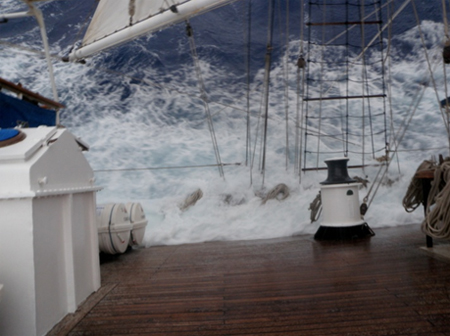Vers 14 h 10, lorsque le deuxième officier a annoncé une averse imminente, certains des étudiants qui n'était pas en classe sont sortis sur le pont pour voir la pluie. Ces étudiants se sont rassemblés à l'embelle du navireNote de bas de page 21. Le navire a alors commencé à s'incliner, ce qui a immergé le livet de pont, puis, rapidement, le bastingage à bâbordNote de bas de page 22. Le navire s'inclinant de plus en plus, et ce, à cadence élevée, un des étudiants est tombé dans la mer, mais a réussi à remonter sur le voilier, près de la timonerie. D'autres étudiants ont attrapé de l'équipement de pont pour se retenir alors que le navire s'est retrouvé engagé à bâbord.