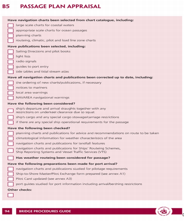 Le formulaire d'une page n'indiquait toutefois pas que l'équipe à la passerelle avait exécuté les 4 étapes de la planification du voyage, pas plus qu'il n'indiquait que le Bridge Procedures Guide de la ICS avait été suivi pour la planification du voyage, tel que le mentionne le manuel MQSE de la compagnie. Le formulaire rempli n'indique pas que l'équipe à la passerelle s'est conformée au manuel MQSE de la compagnie, ni qu'elle s'est servie du formulaire d'évaluation de la planification du voyage contenu dans le Bridge Procedures Guide de la ICS. Ce formulaire énumère les étapes de la planification du voyage, et mentionne la nécessité de se procurer l'information locale pertinente pour la sécurité maritime ainsi que les avertissements locaux (Annexe B).