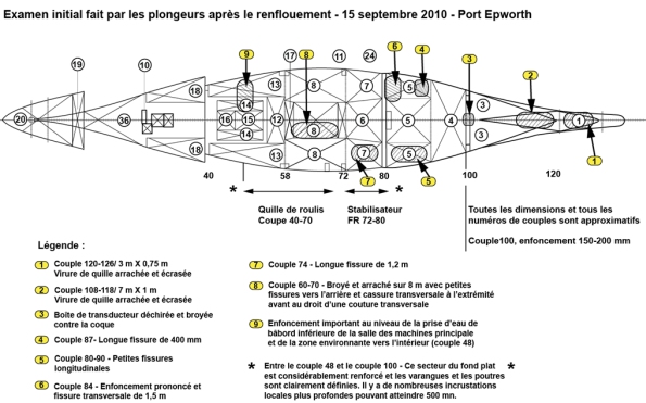 Le 1er septembre 2010, une équipe de plongeurs et une compagnie de sauvetage engagée par la compagnie gestionnaire du navire pour renflouer le Clipper Adventurer arrivent sur les lieux. Les plongeurs constatent que la coque est lourdement endommagée à partir du coqueron avant jusqu'à l'arrière du milieu et que 13 compartiments et citernes à double–fond de ballastage, y compris 4 citernes de carburant diesel pleines sont percées – et non 7 comme l'équipage l'a initialement indiqué.