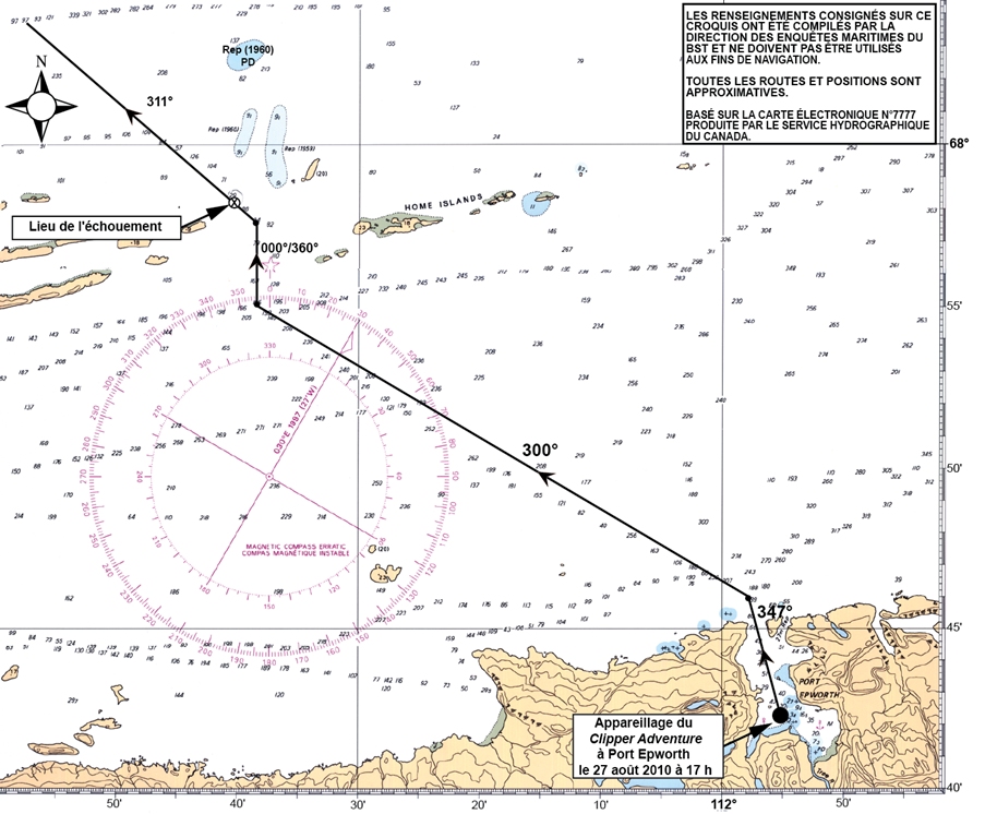 Le 27 août 2010, le navire fait escale à Port Epworth. Il est censé compléter son itinéraire à Kugluktuk à 8 h Note de bas de page 12 le lendemain matin. Avant de quitter le mouillage, l'équipe à la passerelle prépare les caps à suivre de Port Epworth à Kugluktuk en se servant de la carte no 7777 du Service hydrographique du Canada (SHC). Une fois l'excursion sur la côte à Port Epworth terminée, le navire appareille à 17 h, 3 heures à l'avance sur son horaire. Au moment du départ, le capitaine en second, le timonier et le capitaine sont sur la passerelle.