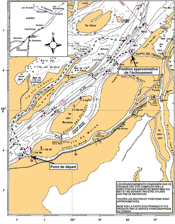 Ignorant la position du navire par rapport à la bouée, le capitaine arrête les moteurs. Le navire dérive pendant quelques minutes tandis que le grain s'abat sur lui, jusqu'à ce qu'il s'échoue dans la vase à 14 h 35 à l'embouchure du rigolet des Chenaux, à la position suivante : 46° 06′ 24″ N, 072° 57′ 58″W.