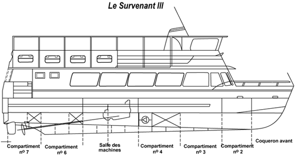 Le Survenant III est un petit navire à passagers couvert à 2 ponts, qui est fait d'aluminium soudé et qui est muni d'un arrière à tableau (voir la photo 1 et l'annexe B). La passerelle de navigation se trouve sur l'avant du pont supérieur. Les fenêtres du pont supérieur sont équipées de charnières et peuvent être rabattues par mauvais temps (voir la photo 2), mais ne sont pas étanches aux intempéries. Le navire est propulsé par 2 moteurs diesel et est équipé de 2 hélices et de 2 gouvernails. Il dispose aussi de 2 ancres placées à la proue.
