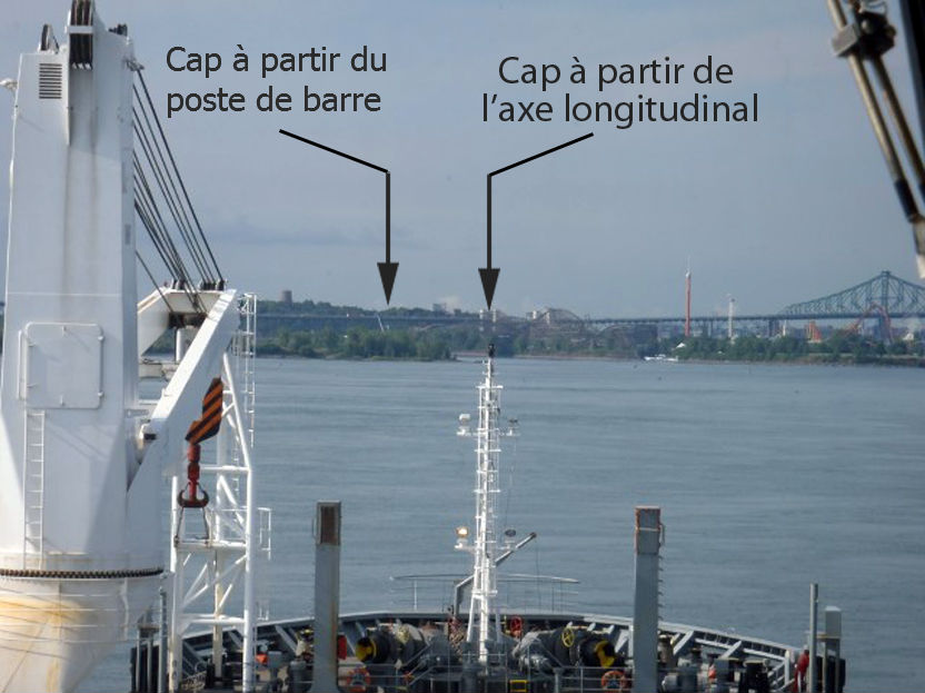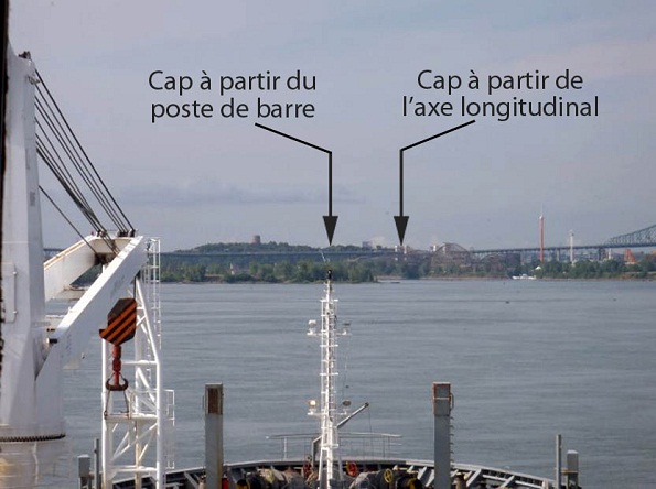 Sur le BBC Steinhoeft, le poste de barre se trouve 2,92 m à tribord de l'axe longitudinal du bâtiment. Ceci entraîne une erreur de parallaxe d'environ 1,6° à tribord si la ligne visuelle débute au poste de barre (annexe E). Le pilote no 1 savait que le poste de barre était décalé par rapport à l'axe longitudinal, mais a estimé que l'erreur possible était d'environ 0,5°