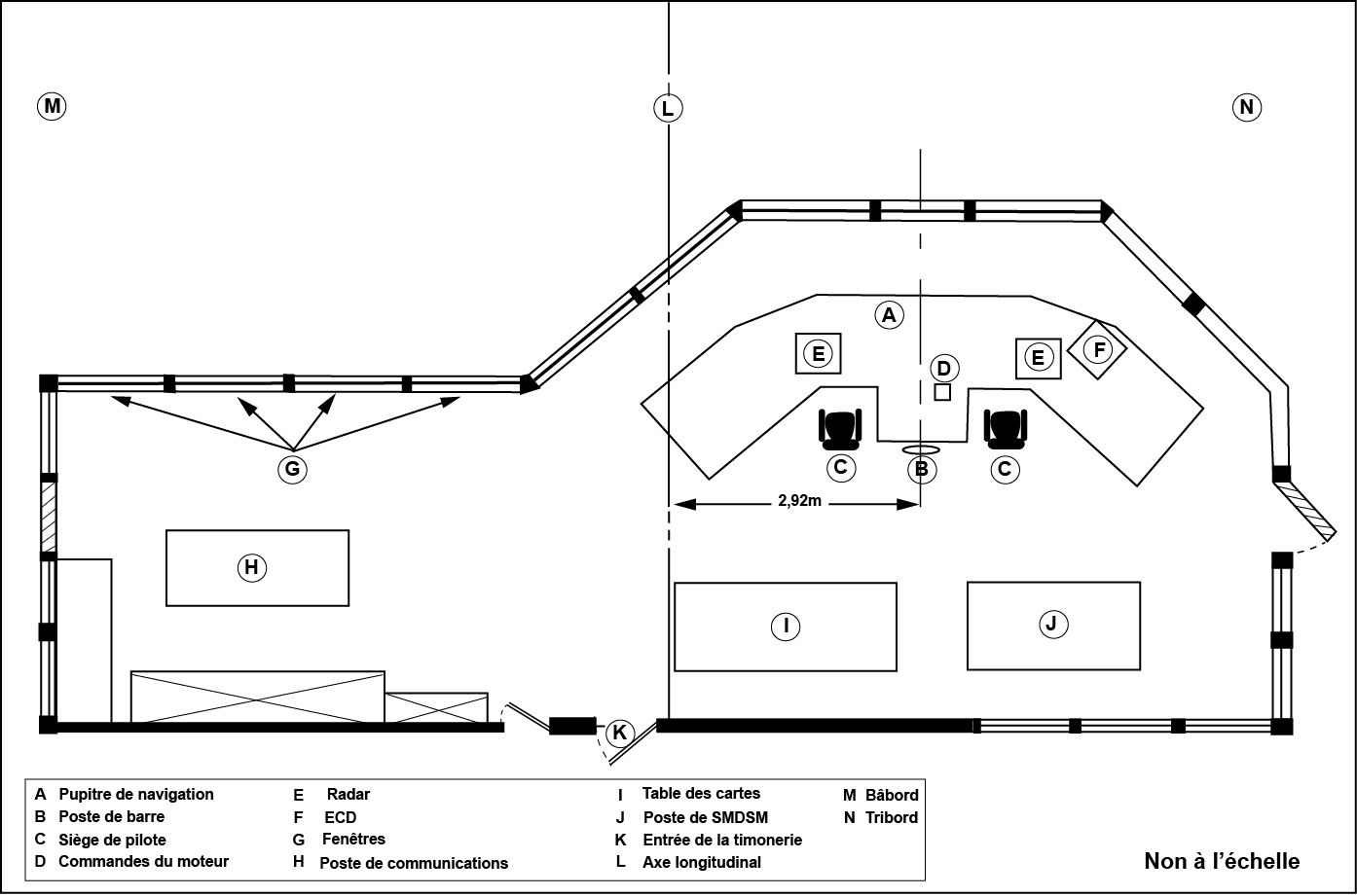 Afin que la visibilité ne soit pas gênée par ces deux grues, le poste de direction de la manœuvre (poste de barre) est placé à tribord de l'axe longitudinal du navire (voir la figure 1).