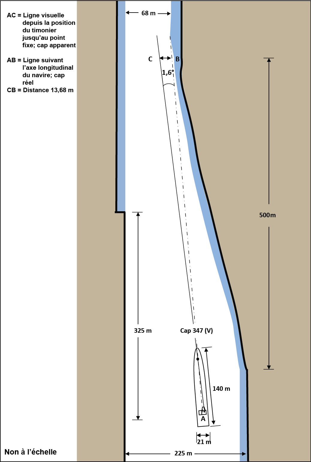 - Après que le pilote no 1 ait ordonné au timonier de gouverner vers un point de référence visuel, le bâtiment a suivi un trajet qui l'a amené plus près de la berge sud qu'il ne l'aurait fallu.