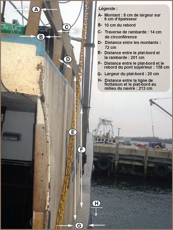 Un pont abri couvre la moitié avant du pont principal des 2 côtés. Les mesures du côté tribord sont indiquées dans la photo 2. Il n'y a pas de main courante particulière pour faciliter les déplacements le long du plat-bord. Un membre d'équipage peut placer les mains le long du rebord supérieur, ou encore saisir la partie inférieure des montants de la rambarde ou les barres horizontales qui relient les montants. De 75 % à 80 % des hommes se tenant sur le plat-bord sont capables d'atteindre la rambarde avec les mainsNote de bas de page 2.