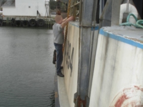 Pour récupérer le paravane côté tribord sur le Silver Angel, le matelot de pont marchait normalement sur le plat-bord (photo 5) en tirant la corde de remontée et la passait lui même dans la poulie coupée. Parvenu au taquet tribord, le membre d'équipage sur le pont supérieur donnait du mou à la corde, au besoin. Le matelot avait déjà exécuté cette tâche avec succès des centaines de fois et démontré une grande agilité. Les autres membres d'équipage ne marchaient pas sur le plat-bord, préférant attendre sur le pont qu'un autre matelot leur passe la corde de remontée. La direction de l'entreprise n'était pas au courant de la méthode employée par ce matelot.