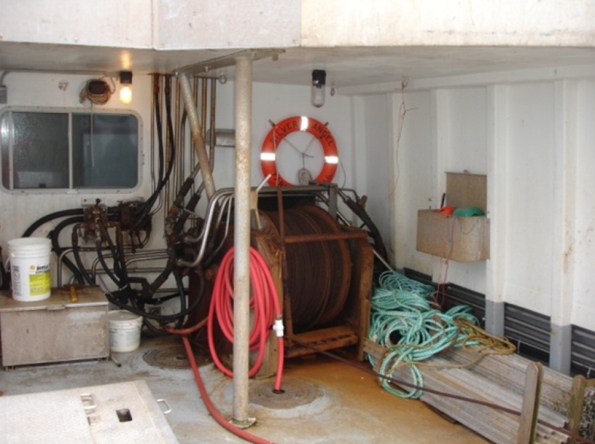 Pour remonter un paravane (Figure 1), un membre d'équipage se trouvant sur le pont supérieur devait enlever du taquet la corde de remontée, se déplacer vers l'arrière et passer la corde à un matelot attendant sur le pont arrière. Si le parcours entre le taquet et l'arrière du pont supérieur était bloqué par des bacs de manutention imbriqués (photo 4), le membre d'équipage devait alors marcher ou ramper sur les bacs, passer la corde au matelot qui attendait, lequel devait ensuite grimper sur le portique et passer la corde dans la poulie coupée. En procédant de cette façon, aucun matelot du Silver Angel n'avait besoin d'emprunter le plat bord pour récupérer les cordes de remontée des paravanes.