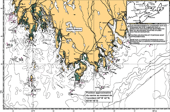 À 10 hNote de bas de page 3, le matin du 2 mai 2011, après avoir débarqué un chargement de merlus argentés à East Jeddore (Nouvelle-Écosse), le Silver Angel a pris la mer pour se rendre à East Pubnico (Nouvelle-Écosse). Le capitaine était accompagné d'un matelot de pont. Au lieu de monter sur le navire, un deuxième matelot de pont est parti en voiture vers East Pubnico. Il devait ramener les 2 autres membres d'équipage à la maison, après leur arrivée à East Pubnico. Le bateau devait ensuite être sorti de l'eau pour l'inspection quadriennale de Transports Canada (TC).