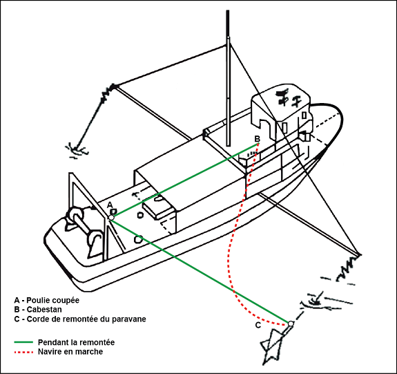- En raison de la configuration de l'équipement de récupération des paravanes installé sur le navire, il était possible de récupérer la corde de remontée du paravane en marchant sur le plat-bord.
