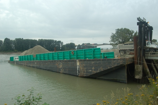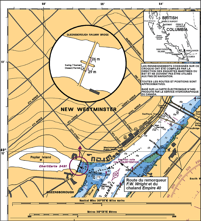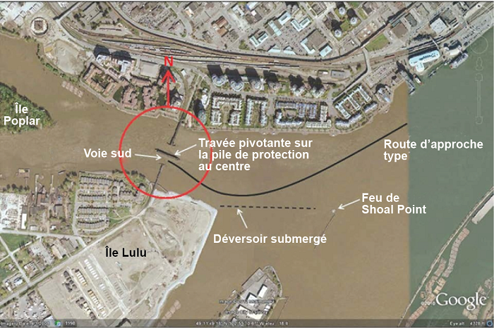 Une fois passé les ponts à New Westminster, l'approche habituelle établie pour un remorqueur et un chaland en aval du pont ferroviaire Queensborough consiste à longer de préférence la rive ouest du fleuve Fraser. Cette approche exige que le remorqueur se dirige vers la pointe nord-est de l'île Lulu, à environ 230 m à l'est du pont ferroviaire Queensborough. Lorsque le remorqueur et le chaland approchent la pointe nord-est, la déviation de l'eau provoquée par un déversoir submergé entre cette pointe et Shoal Point, aménagé il y a longtemps pour réduire l'envasement, porte le chaland vers le nord à l'approche du pont. Il faut contrer cette poussée en se dirigeant vers l'ouverture du côté sud (voir la Photo 4 pour la route type).