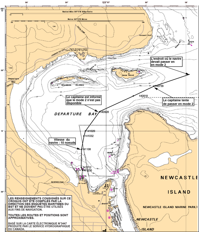 Lorsque le Queen of Coquitlam s’approche de la baie Departure, le manuel propre au navire exige que le navire passe du mode de propulsion 1 au mode de propulsion 2 pour l’arrivée et l’accostage. La procédure décrivant les vérifications à faire avant l’accostage Note de bas de page 7 précise que le navire doit passer en mode 2 lorsque la bouée de Horswell est par le travers du navire. Le capitaine n’a pas tenté de passer en mode 2 avant que l’île Jesse, qui se trouve à 0,5 nm à l’ouest de la bouée de Horswell et plus près du quai, soit par le travers du navire. En outre, le personnel de la passerelle n’a pas vu que le navire n’était pas passé en mode 2 avant que celui-ci soit dans la baie Departure, à 0,9 nm à l’ouest de la bouée de Horswell. En ne tentant pas de passer en mode 2 à l’endroit indiqué dans le manuel propre au navire, le capitaine disposait de peu de temps pour évaluer la situation et prendre des mesures correctives.