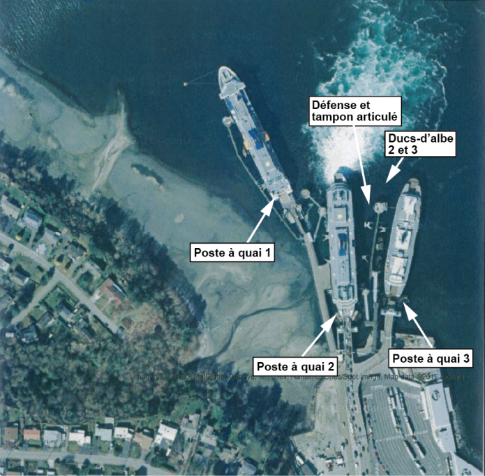 À 14 h 10, le capitaine a continué de tourner vers le port afin d’aligner le navire pour l’approche au poste à quai nº 2. Le navire progressait à 12 nœuds, et se trouvait à environ 5 encablures du poste à quai. À 14 h 11, le capitaine a mis le moteur en marche arrière afin de réduire la vitesse. À 14 h 12, l’étrave du navire a dévié de sa trajectoire à bâbord pour se diriger sur la défense la plus à l’extérieur du côté bâbord. Le capitaine a mis la barre à droite toute. Peu après, le capitaine a ordonné au premier lieutenant de donner des coups de sifflet d’avertissement et d’annoncer aux passagers la possibilité d’un accostage dur.