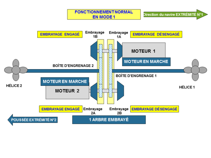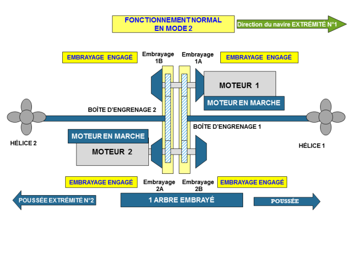 Ce mode est utilisé principalement pour les manœuvres d’accostage et d’appareillage. Dans ce mode, lorsque les 2 moteurs sont utilisés, les 4 embrayages sont tous engagés, entraînant les 2 hélices (Figure 2). Passer en mode 2 prend environ 90 secondes, soit le temps que prend l’hélice avant pour passer de la position en drapeau à un pas qui permet aux embrayages d’être mis en prise.